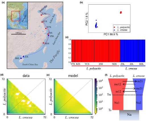 大黃魚(Larimichthys crocea)和小黃魚(L. polyactis)為西北太平洋特有漁業(yè)資源,兩個物種的體型、產(chǎn)卵洄游路線和越冬場等種群生物學(xué)特征迥異,但彼此在東海北部的產(chǎn)卵時間、產(chǎn)卵場和育幼場卻有重疊。黃海水產(chǎn)研究所漁業(yè)分子生態(tài)學(xué)團隊的早期研究證明,這兩個姊妹種在更新世冰川時期發(fā)生分離,其分離所為分別位于東海和南海的兩個避難所。冰川消退后,兩個物種都經(jīng)歷了快速擴張和部分接觸,并適應(yīng)了多樣化的環(huán)境條件,例如產(chǎn)卵溫度和鹽度。該團隊根據(jù)兩個物種在重疊分布區(qū)域的種群混合現(xiàn)象,提出了黃魚屬的種化可能遵循二次接觸的物種形成模型假說。通過繪制高質(zhì)量的小黃魚染色體水平基因組圖譜,開展了這對姊妹種在演化動力影響下的等位基因改變和分布模式研究,揭示了小黃魚與大黃魚基因組的異質(zhì)性分化景觀及其進化機制。本項研究不僅從物種分化的景觀基因組學(xué)角度解析了小黃魚和大黃魚的演化機制,而且為小黃魚的種群遺傳學(xué)研究以及基因組育種工作提供了重要的遺傳資源。相關(guān)研究成果發(fā)表在Molecular Ecology上。