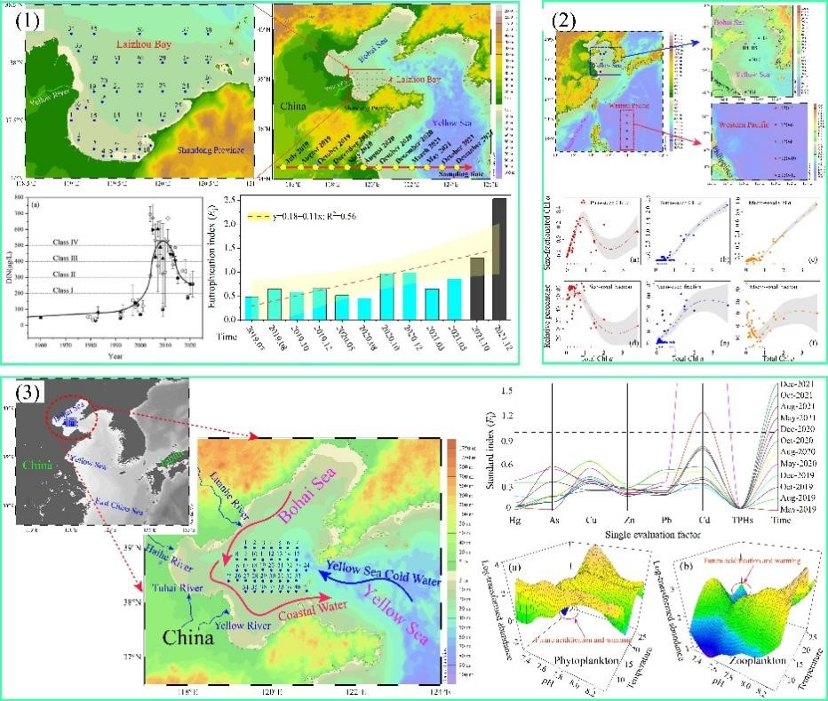 人類活動是近海生態(tài)系統(tǒng)演變的重要驅(qū)動力,頻繁的人類活動導(dǎo)致近海富營養(yǎng)化程度加重,改變浮游生物的群落結(jié)構(gòu),進而破壞了海洋生態(tài)系統(tǒng)平衡。黃海水產(chǎn)研究所海水陸基工廠化養(yǎng)殖創(chuàng)新團隊圍繞人類活動對近海生態(tài)系統(tǒng)影響及浮游植物變化響應(yīng),以黃渤海為重點研究區(qū)域,基于長期系統(tǒng)的環(huán)境調(diào)查數(shù)據(jù),分析了氮、磷等生源要素的空間變化特征,闡明了萊州灣40年來氮、磷的長期演變規(guī)律,評估了水體富營養(yǎng)化水平,解析了陸源污染等影響近海環(huán)境變化的關(guān)鍵因素;采用生態(tài)風(fēng)險評估指數(shù)闡明了重金屬對近海生態(tài)環(huán)境的潛在風(fēng)險,研究發(fā)現(xiàn)渤海沉積物中重金屬鎘(Cd)對渤海生態(tài)環(huán)境健康具有潛在威脅;基于GAMs模型對比分析了黃渤海與西太平洋中分粒級葉綠素的差異,研究發(fā)現(xiàn)黃渤海以Nano級葉綠素含量為主,西太平洋以Pico級葉綠素含量為主;揭示了渤海海域浮游生物群落對酸化和暖化等全球氣候變化的響應(yīng),表現(xiàn)為浮游植物增加、浮游動物減少,研究成果為闡明人類活動對近海生態(tài)環(huán)境影響、海洋生態(tài)系統(tǒng)對氣候變化的響應(yīng)機理奠定理論基礎(chǔ)。相關(guān)研究成果發(fā)表在Environmental Research,Marine Pollution Bulletin和Frontiers in Microbiology。