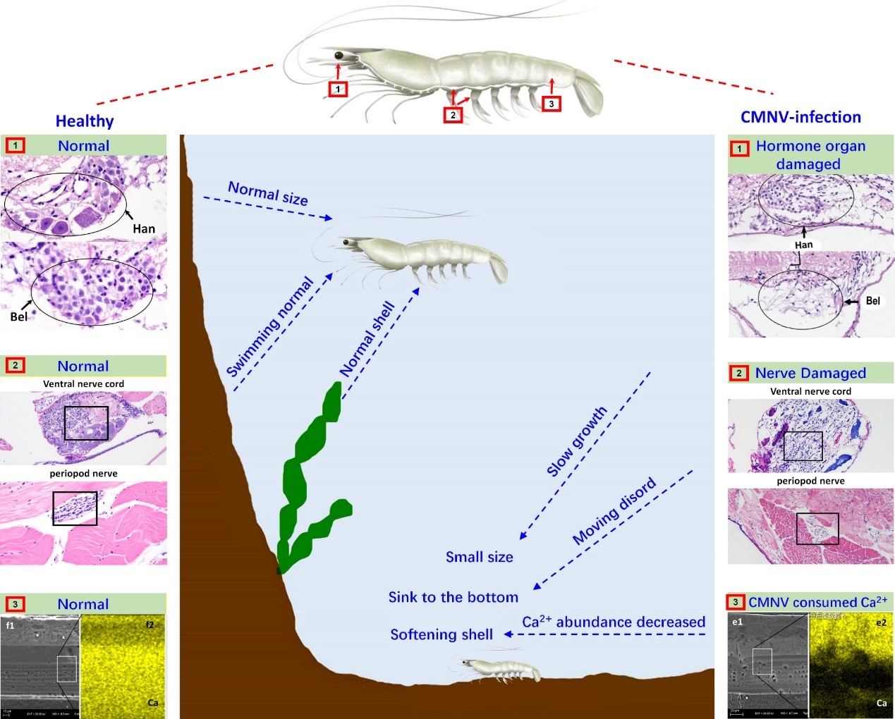 圖2.偷死野田村病毒(CMNV)感染對蝦的致病機理