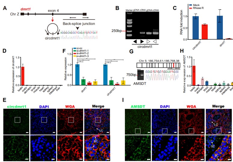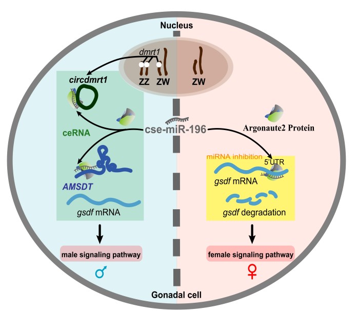 該研究以兼具遺傳和環(huán)境性別決定型的半滑舌鰨為模型,繪制了雌魚卵巢、雄魚和偽雄魚精巢的高精度單細胞圖譜,首次發(fā)現(xiàn)硬骨魚卵巢中存在多種功能異質(zhì)的顆粒細胞亞群,揭示了魚類精子發(fā)生過程的基因動態(tài)表達特征和偽雄魚精子發(fā)生異常的細胞學(xué)基礎(chǔ)。進一步繪制了雌魚、雄魚和偽雄魚性腺的ncRNA動態(tài)表達圖譜和ceRNA調(diào)控網(wǎng)絡(luò),發(fā)現(xiàn)一個來源于性別決定基因dmrt1外顯子4上的環(huán)狀RNA(circdmrt1)和來自于常染色體上的lncRNA(AMSDT)可與cse-miR-196、gsdf形成復(fù)雜的雙重ceRNA調(diào)控關(guān)系,解析了ceRNA調(diào)控魚類性別決定與分化的表觀遺傳機制,證實了ceRNA介導(dǎo)的分子通路是調(diào)控魚類性別決定與分化的有效途徑。該研究不僅豐富了魚類性別決定與分化的表觀調(diào)控理論,而且為魚類性控育種技術(shù)的研發(fā)開辟了新途徑。