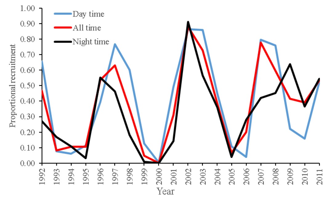 圖2.晝夜采樣差異對南極磷蝦種群補充參數(shù)估算的影響