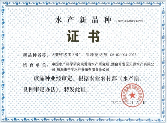 黃海水產(chǎn)研究所大菱鲆和石斑魚遺傳育種創(chuàng)新團隊利用規(guī)模化家系選育、分子標(biāo)記輔助育種和配套系雜交育種技術(shù),培育出速生耐高溫大菱鲆“多寶2號”新品種(GS-02-004-2022)。以優(yōu)良品種推廣為主線,配套適宜網(wǎng)箱和工廠化養(yǎng)殖模式的實用技術(shù),在山東、江蘇、福建等沿海地區(qū)進行了產(chǎn)業(yè)化示范推廣,周期單位產(chǎn)量提高15%以上,實現(xiàn)了規(guī)?;瘍?yōu)質(zhì)苗種的穩(wěn)定供應(yīng),在大菱鲆主產(chǎn)區(qū)高溫季節(jié)為促進大菱鲆產(chǎn)業(yè)進一步發(fā)展提供了保障。