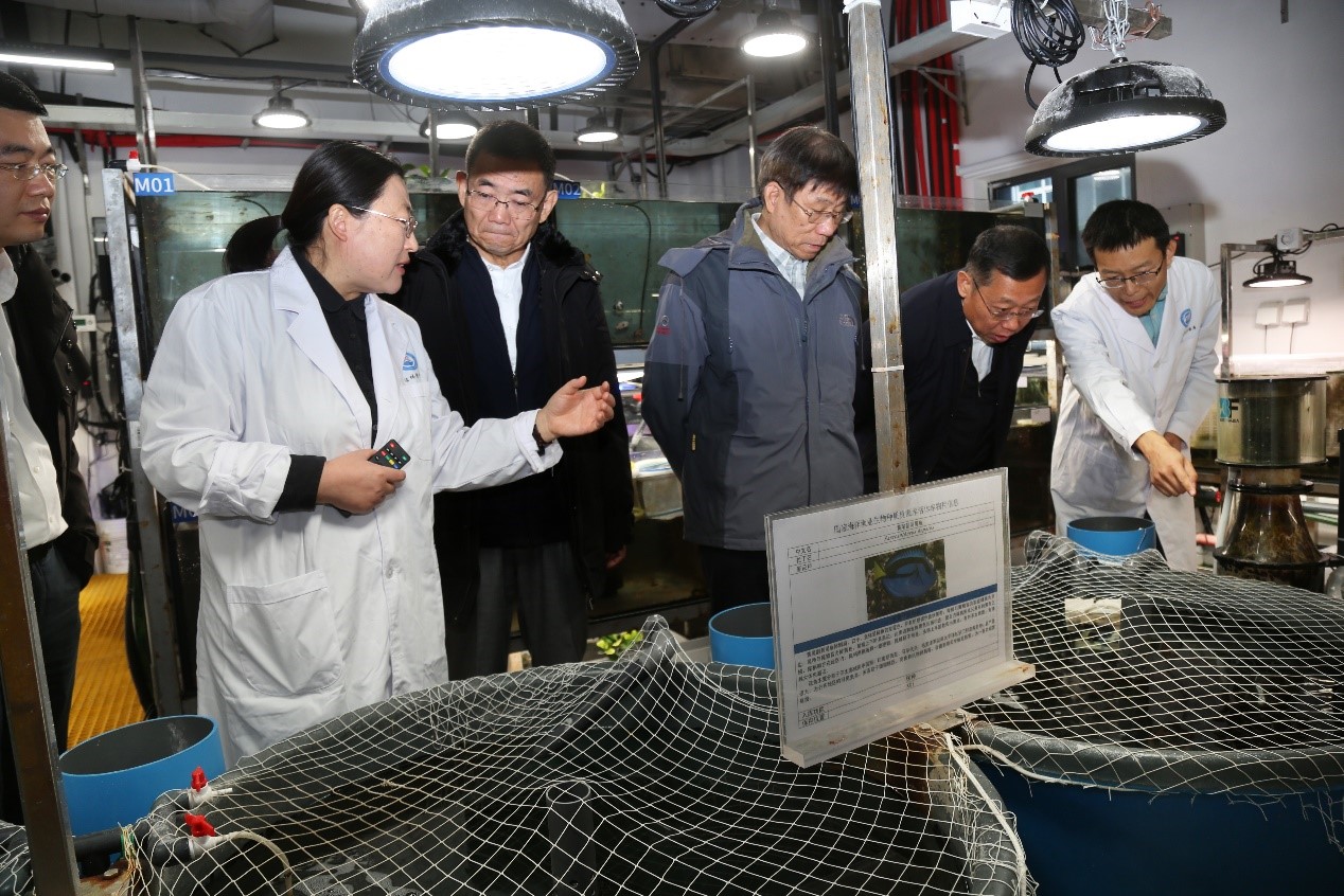 11月24日,國務(wù)院國資委國有重點大型企業(yè)監(jiān)事會原主席楊堅,全國政協(xié)委員、中國農(nóng)業(yè)科學(xué)院原黨組書記張合成,中國遠洋漁業(yè)協(xié)會會長、農(nóng)業(yè)農(nóng)村部漁業(yè)漁政管理局原局長張顯良等一行4人到國家海洋漁業(yè)生物種質(zhì)資源庫(以下簡稱“資源庫”)調(diào)研。中國工程院院士唐啟升,中國水產(chǎn)科學(xué)研究院黃海水產(chǎn)研究所副所長葉乃好、榮小軍、原副所長辛福言及相關(guān)部門負責(zé)人員接待了調(diào)研組一行。
