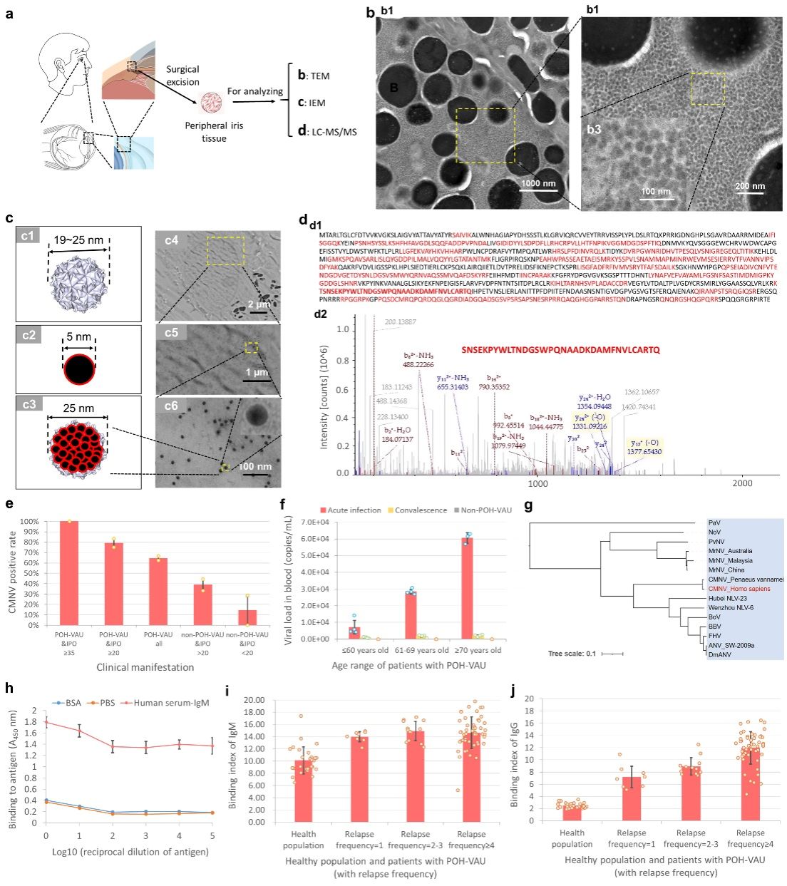 研究團隊聚焦于臨床一種新發(fā)、病因不明的“持續(xù)性高眼壓病毒性前葡萄膜炎(POH-VAU)”,其臨床表現(xiàn)為反復發(fā)作的輕度前葡萄膜炎、藥物難以控制的持續(xù)性高眼壓(部分患者眼壓逾50 mmHg)、角膜后少量沉著物(KPs)及視神經損傷。此前由于常規(guī)療法效果不佳,其病因始終未能查明。研究人員利用透射電鏡、免疫電鏡及高靈敏技術(LC-MS/MS和qPCR),在患者手術切除的虹膜組織中成功鑒定到了CMNV病毒顆粒及其特異性蛋白序列,與已知CMNV蛋白序列同源性高達98.96%。隨后的血清學研究進一步揭示,在受訪的70名確診患者血液中,均檢測到CMNV特異性IgM和IgG抗體轉化;且患者體內病毒載量與其眼壓水平呈顯著正相關。這一系列發(fā)現(xiàn)從病原學和免疫學角度證實了CMNV感染與該新型眼病直接關聯(lián)。