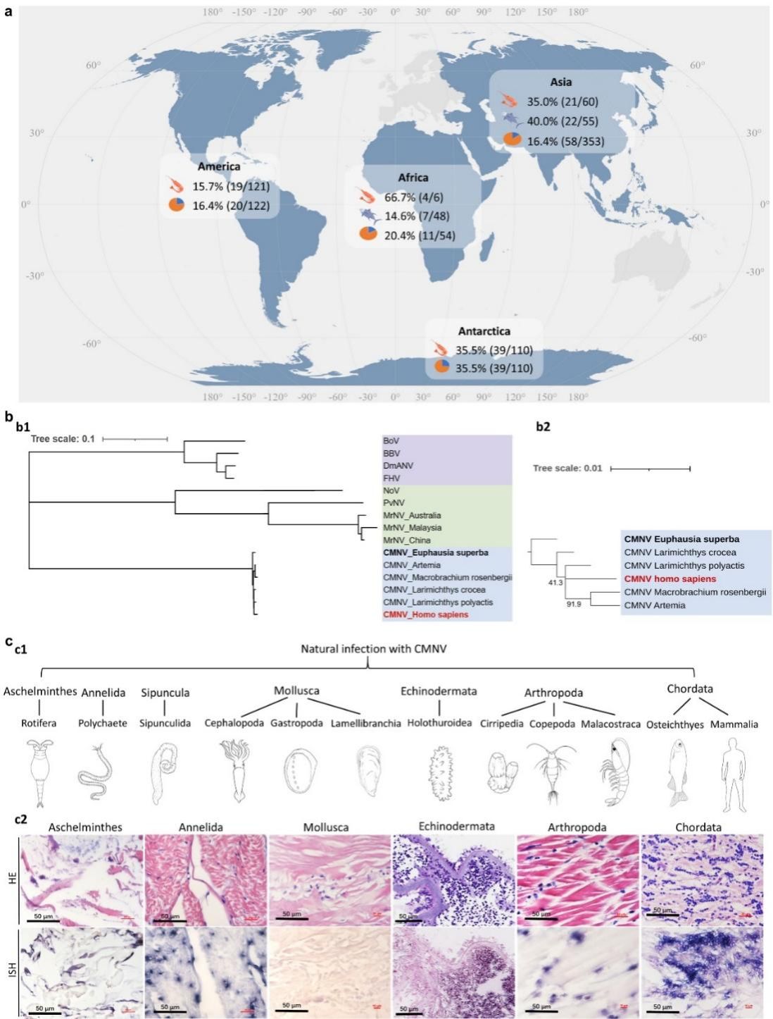 此外,全球范圍的分子流行病學調查揭示出,CMNV病毒在亞洲、美洲、歐洲、非洲及南極洲的養(yǎng)殖和野生水生動物體內廣泛存在。在南極磷蝦樣本中,該病毒的陽性率高達35.5%,其宿主范圍橫跨了甲殼亞門和脊椎動物亞門等10個動物亞門。系統(tǒng)發(fā)育分析顯示,從南極磷蝦中分離的CMNV毒株處于進化樹的基部(根部)。結合極高的流行率,研究團隊推測,南極磷蝦極可能是CMNV的原始自然宿主。這預示著該病毒在海洋生態(tài)系統(tǒng)中擁有古老的進化歷史,并具備廣泛的宿主適應性。