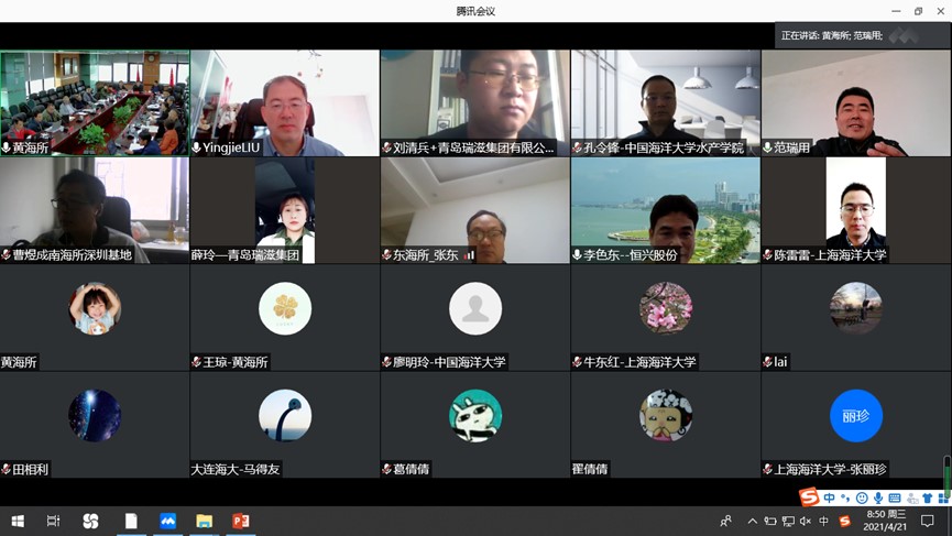 4月21日,中國水產(chǎn)科學研究院黃海水產(chǎn)研究所牽頭承擔的國家重點研發(fā)計劃“藍色糧倉科技創(chuàng)新”重點專項“海水池塘和鹽堿水域生態(tài)工程化養(yǎng)殖技術(shù)與模式(2019YFD0900400)”項目2020年度總結(jié)暨2021年工作推進會在山東青島召開。項目跟蹤專家中國科學院海洋研究所楊紅生研究員、中國水產(chǎn)科學研究院漁業(yè)機械儀器研究所徐皓研究員,咨詢專家中國水產(chǎn)科學研究院劉英杰研究員、廣東恒興飼料實業(yè)股份有限公司李色東教授級高工參會指導。來自中國水產(chǎn)科學研究院黃海水產(chǎn)研究所、中國科學院海洋研究所、中國海洋大學、中國水產(chǎn)科學研究院東海水產(chǎn)研究所、中國水產(chǎn)科學研究院黑龍江水產(chǎn)研究所、寧波大學、中國水產(chǎn)科學研究院南海水產(chǎn)研究所深圳試驗基地、上海海洋大學、大連海洋大學、青島瑞滋集團有限公司等10家項目參與單位共50余人參加了會議。