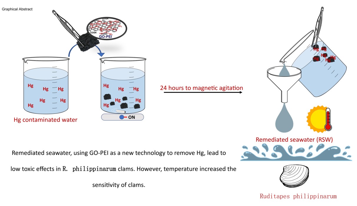 在此研究基礎(chǔ)上,該團隊聯(lián)合葡萄牙研究團隊研發(fā)并應(yīng)用了氧化石墨烯-聚乙烯亞胺復(fù)合納米材料(GO-PEI)用于吸附污染海水中的Hg2+。結(jié)果顯示,GO-PEI對污染海水中Hg2+具有很好的吸附效果(吸附率>90%),且經(jīng)GO-PEI修復(fù)后的海水在生化指標及組織病理等水平上均未對菲律賓蛤仔造成顯著影響,確認了GO-PEI作為海水污染物高效吸附材料的安全性。