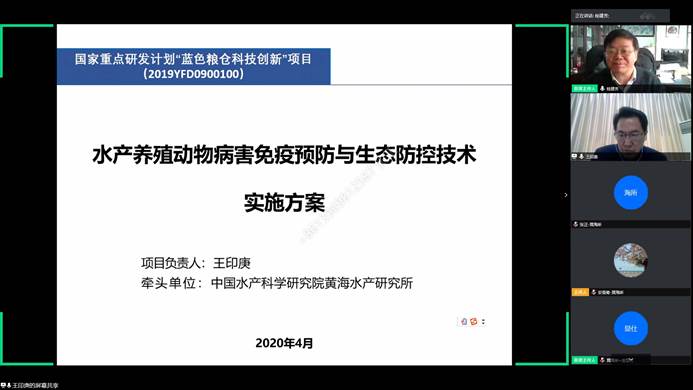 4月24日,由中國水產(chǎn)科學(xué)研究院黃海水產(chǎn)研究所牽頭承擔(dān)的國家重點研發(fā)計劃“藍(lán)色糧倉科技創(chuàng)新”重點專項—“水產(chǎn)養(yǎng)殖動物病害免疫預(yù)防與生態(tài)防控技術(shù)”項目啟動會以視頻會議的形式召開。啟動會由黃海水產(chǎn)研究所所長金顯仕主持,科學(xué)技術(shù)部中國農(nóng)村技術(shù)開發(fā)中心“藍(lán)色糧倉科技創(chuàng)新”項目專員魯淼、農(nóng)業(yè)農(nóng)村部漁業(yè)漁政管理局漁情監(jiān)測與市場加工處處長徐樂俊,山東省黃河三角洲農(nóng)業(yè)高新技術(shù)產(chǎn)業(yè)示范區(qū)管委會副主任王守寶,項目咨詢專家組桂建芳院士、包振民院士、宋林生教授、王春琳教授、楊紅生研究員、劉英杰研究員、徐皓研究員、郝智慧教授、王雷研究員、汪開毓教授、艾桃山研究員、李色東教授級高工和辛乃宏教授級高工等應(yīng)邀出席會議。項目首席、課題負(fù)責(zé)人及項目骨干等100余人參加了本次視頻會議。