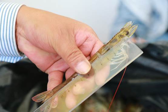 驗(yàn)收專家聽取了項(xiàng)目組關(guān)于凡納濱對蝦生態(tài)養(yǎng)殖模式特點(diǎn)、意義及養(yǎng)殖效果的匯報(bào),在收蝦現(xiàn)場實(shí)地查看了收獲盛況;核查養(yǎng)殖檔案、放苗數(shù)量及接種的生物餌料種類;現(xiàn)場隨機(jī)抽樣,對體長及體重進(jìn)行測量,檢查生態(tài)養(yǎng)殖模式下對蝦的健康狀況。對蝦生態(tài)養(yǎng)殖模式下,通過接種鹵蟲、蜾蠃蜚和藻鉤蝦,極大節(jié)省了人工配合飼料的使用。經(jīng)過3-4個月的養(yǎng)殖,畝產(chǎn)達(dá)到了60公斤以上,對蝦規(guī)格達(dá)到12-25g/尾。驗(yàn)收專家一致認(rèn)為,此養(yǎng)殖模式提高了黃渤海沿岸鹽堿地的利用價(jià)值,使廣大蝦農(nóng)和企業(yè)增產(chǎn)、增收,并可從源頭上降低水體富營養(yǎng)化發(fā)生的可能性,增強(qiáng)養(yǎng)殖對蝦的抵抗力和抗逆性,提高對蝦品質(zhì),具有良好的生態(tài)效益和經(jīng)濟(jì)價(jià)值。