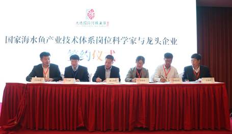產(chǎn)業(yè)健康發(fā)展對(duì)接環(huán)節(jié)由海水魚體系首席科學(xué)家關(guān)長(zhǎng)濤研究員主持。大連天正實(shí)業(yè)有限公司經(jīng)理劉圣聰作為龍頭企業(yè)代表發(fā)布了河豚魚產(chǎn)業(yè)技術(shù)需求,河鲀營(yíng)養(yǎng)需求與飼料崗位梁萌青研究員、細(xì)菌病防控崗位科學(xué)家王啟要教授、保鮮與貯運(yùn)崗位科學(xué)家謝晶教授、寄生蟲病防控崗位科學(xué)家李安興教授、工廠化養(yǎng)殖模式崗位團(tuán)隊(duì)成員賈玉東副研究員,先后就體系研發(fā)的新技術(shù)與新成果進(jìn)行了簡(jiǎn)要介紹。體系專家與企業(yè)代表深入交流,達(dá)成合作共識(shí)。隨后,大連天正實(shí)業(yè)有限公司、江蘇中洋集團(tuán)股份有限公司、大連富谷食品有限公司、福建森海食品有限公司、唐山海都水產(chǎn)食品有限公司等國(guó)內(nèi)河豚魚代表性龍頭企業(yè)與體系相關(guān)崗位團(tuán)隊(duì)簽訂了技術(shù)對(duì)接合作協(xié)議,協(xié)議涵蓋了河鲀種質(zhì)改良、營(yíng)養(yǎng)飼料、疾病防控、養(yǎng)殖模式、流通加工、質(zhì)量安全、經(jīng)濟(jì)市場(chǎng)分析等產(chǎn)業(yè)鏈各環(huán)節(jié)的對(duì)接合作,簽約專家及企業(yè)對(duì)即將開展的實(shí)質(zhì)性合作均充滿信心。