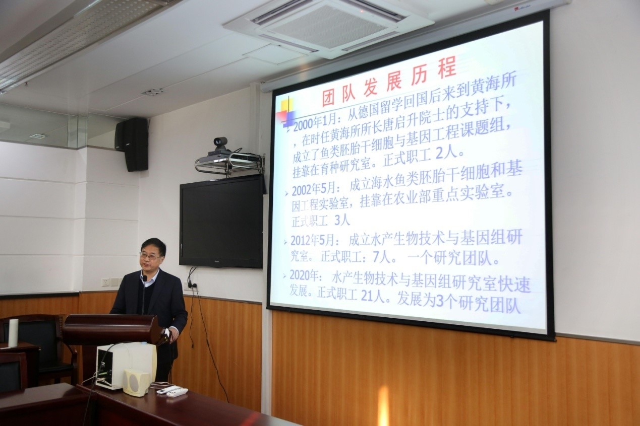 10月26日上午,中國水產(chǎn)科學(xué)研究院黃海水產(chǎn)研究所水產(chǎn)生物技術(shù)與基因組研究室(以下簡稱基因組室)召開了2020年學(xué)術(shù)交流暨學(xué)科建設(shè)研討會,黃海水產(chǎn)研究所副所長李健、科研處處長劉志鴻和人事處處長王騫應(yīng)邀出席了會議?;蚪M室全體職工及研究生參加了會議。