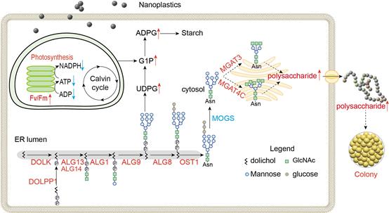 在分子機(jī)制層面,轉(zhuǎn)錄組學(xué)分析發(fā)現(xiàn)納米塑料暴露導(dǎo)致藻細(xì)胞中N-糖原合成相關(guān)基因表達(dá)顯著增加。能量代謝組學(xué)進(jìn)一步揭示,納米塑料通過(guò)上調(diào)己糖激酶、磷酸葡萄糖變位酶等關(guān)鍵酶活性,顯著增強(qiáng)藻細(xì)胞糖酵解途徑通量,促使多糖前體物質(zhì)UDPG(尿苷二磷酸葡萄糖)的積累。這種代謝重編程為囊體大規(guī)模形成提供了物質(zhì)基礎(chǔ)。