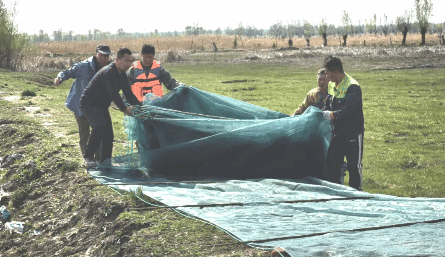 工作人員鋪設(shè)圍網(wǎng)。